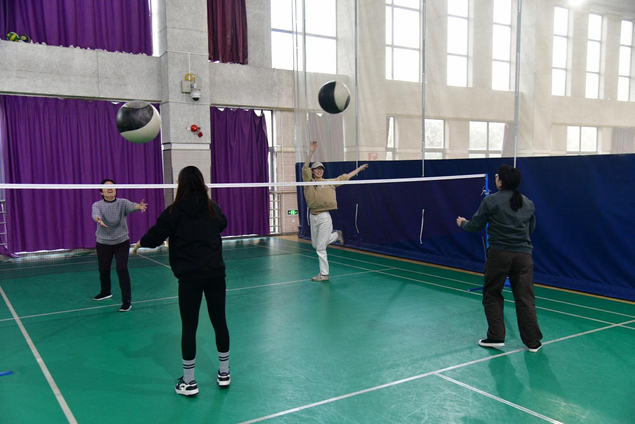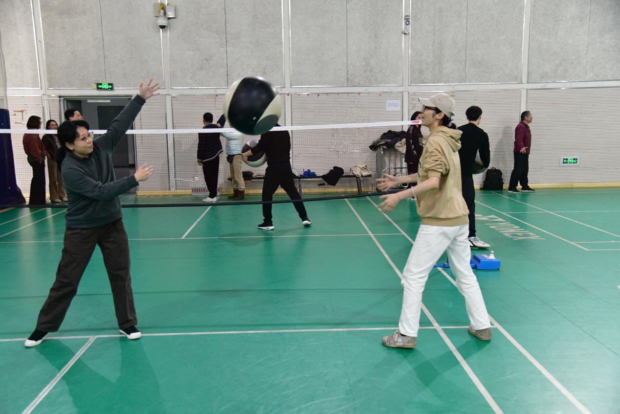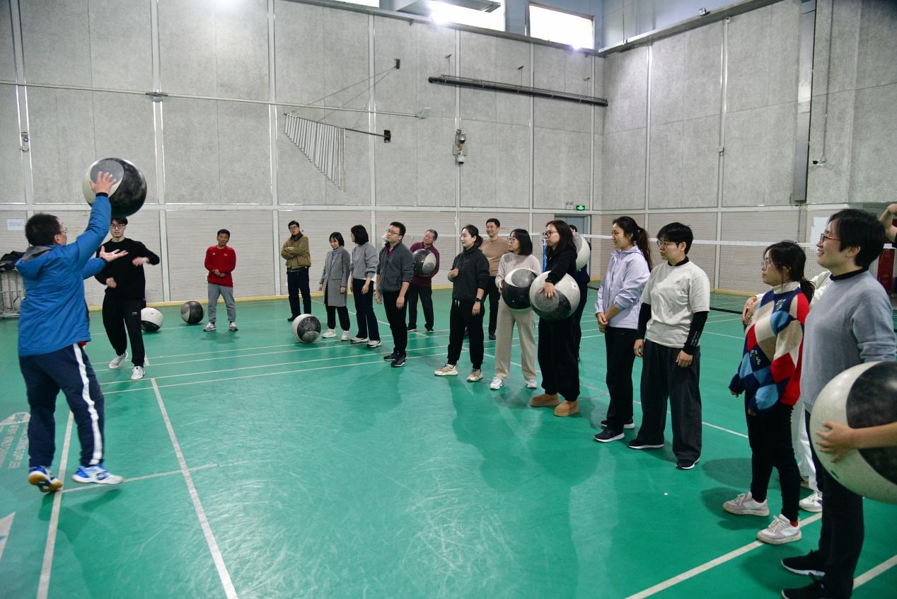 随后,由h动漫 社会体育系教工党支部书记杨建营主持进行了太极柔力球教学实践交流。太极柔力球作为一种融合了中国传统太极理念与现代体育精神的运动,不仅是一种身体锻炼的方式,更是“以体育人”理念的生动体现,为培养具有健康体魄和健全人格的卓越人才提供了一个有效的途径。教师们在杨建营的讲解示范下,练习了太极柔力球的基本技巧和动作要领,深入体验太极柔力球的独特魅力。