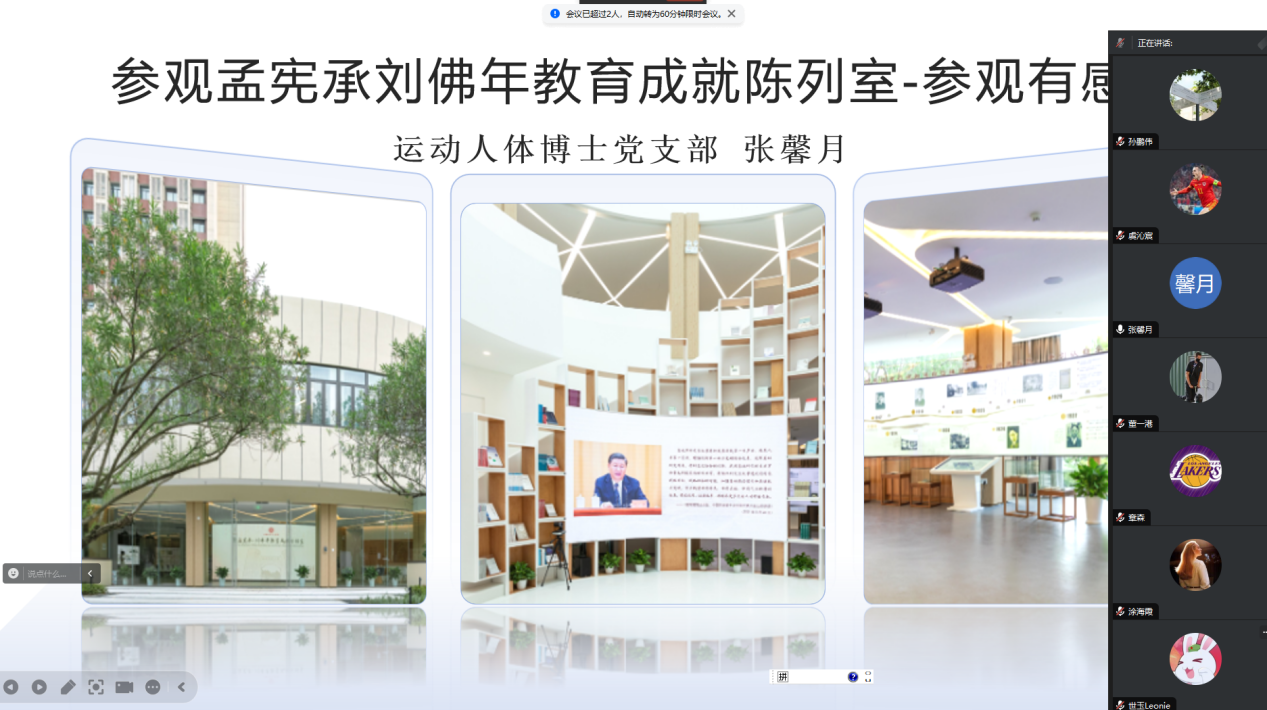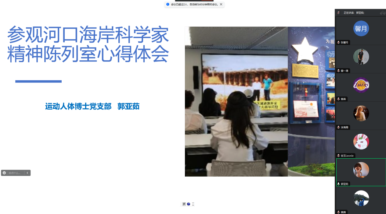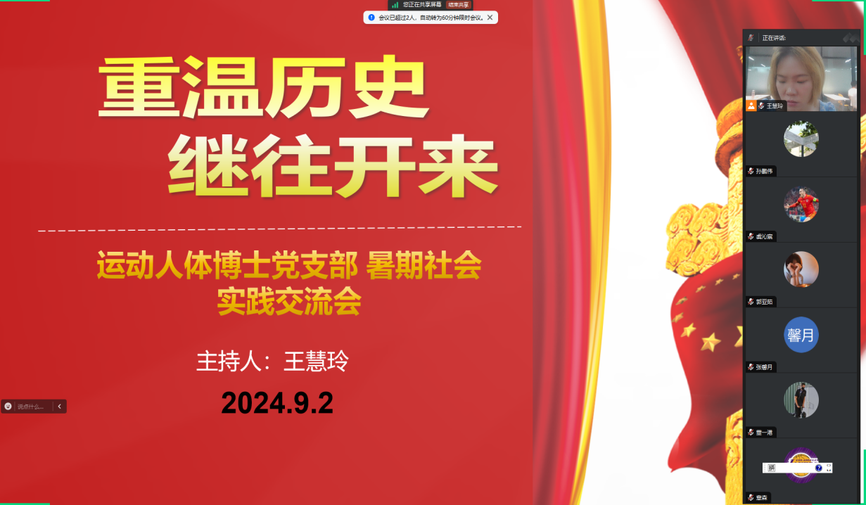 为积极响应教育部有关于深化高校学生暑期社会实践的相关要求与学校党委组织部指导意见,全面落实学院制定的《h动漫 师生党员基本培训实践教学工作方案》,进一步了解党的艰辛历程、光荣传统、宝贵经验和伟大成就,继承弘扬伟大建党精神,运动人体博士党支部于2024年9月2日以“重温历史,继往开来”为主题召开线上暑期社会实践交流会,支部党员对个人或小组的暑期实践经历进行总结并作交流分享,支部全体成员参加,会议由王慧玲同志主持。